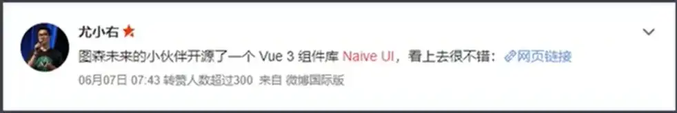 2021年6月7日 尤雨溪在微博上推荐了naive 这个来自图森未来的开源组件库。